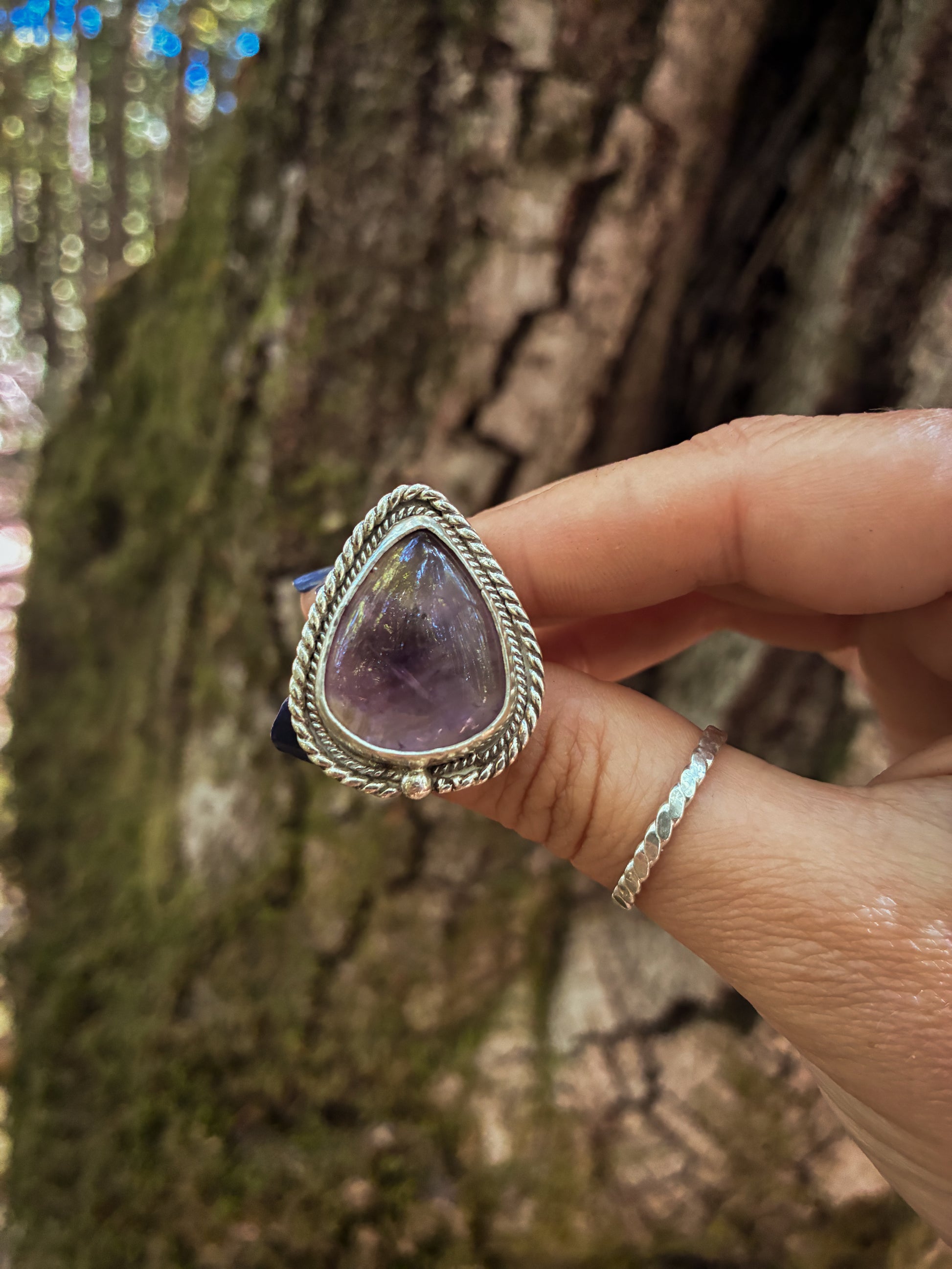 A serene fusion of two powerful energies — amethyst and citrine — this one-of-a-kind ametrine ring radiates clarity, balance, and calm confidence. The teardrop-shaped stone glows with natural gradients of gold and violet, like sunlight piercing through a lavender mist. Set in sterling silver with twisted Wire detailing silver drop accent, this piece brings harmony and quiet strength to your everyday ritual.