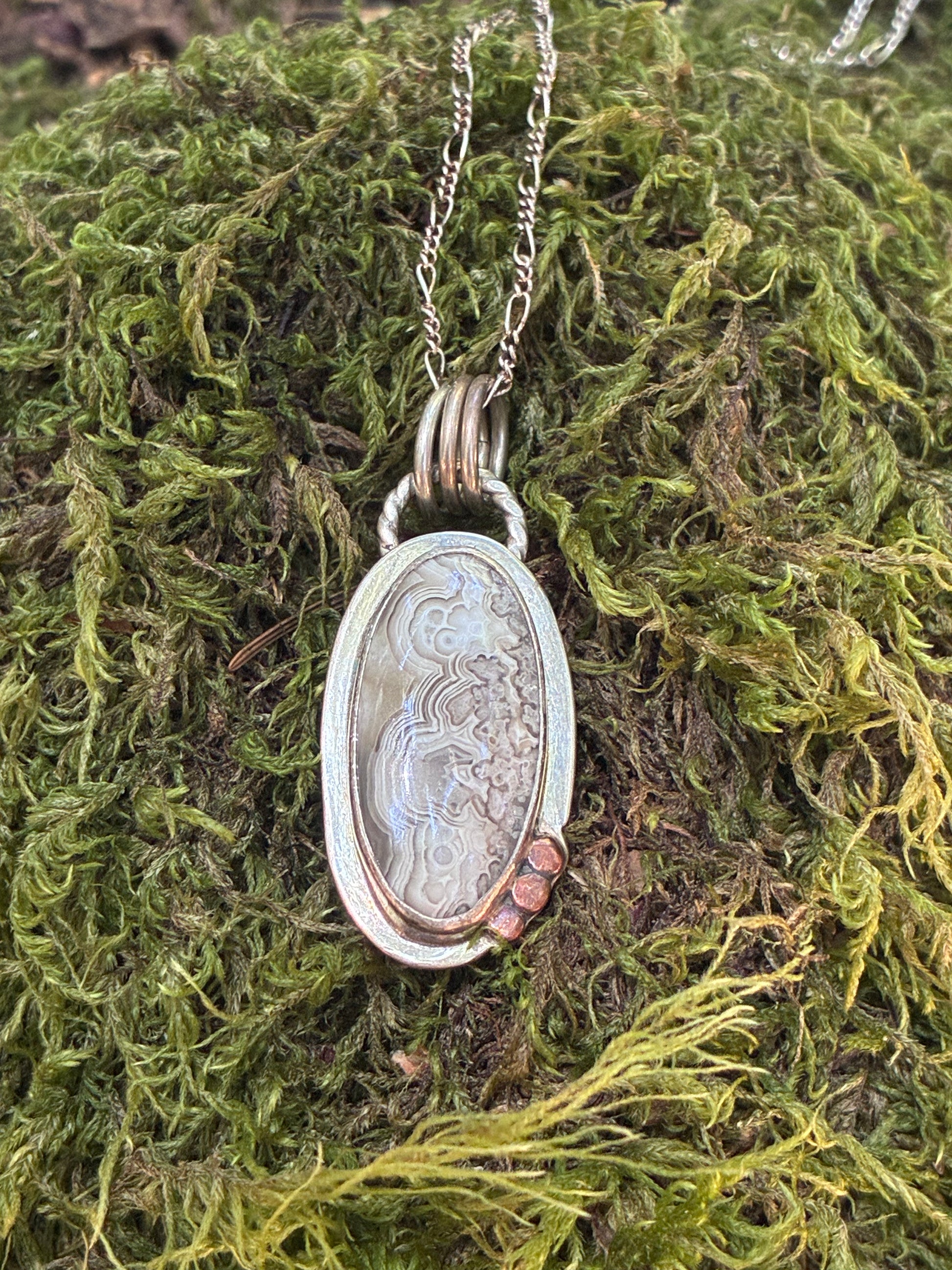 Unearthed elegance. This handcrafted pendant features a mesmerizing natural banded agate with swirling earthy tones—like tree rings etched in stone. Set in solid sterling silver and accented with warm bronze droplets, this piece captures the essence of ancient forests and quiet wisdom.