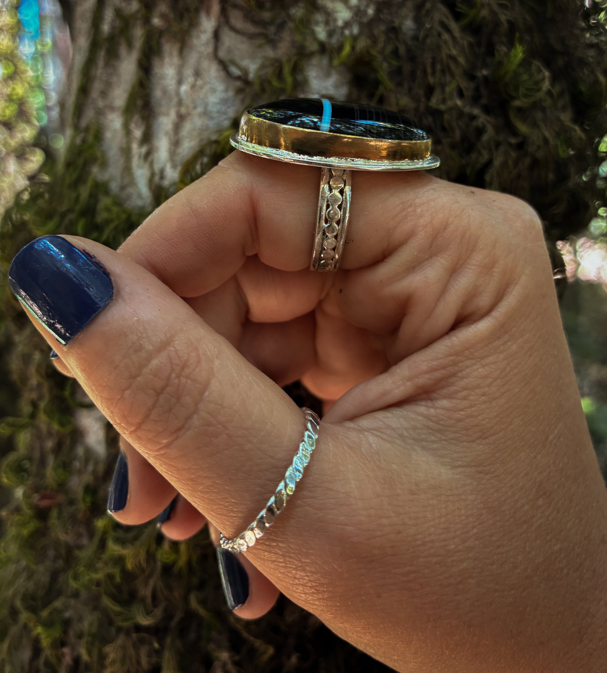 Like a hidden path through ancient woods, this black banded agate ring holds a mysterious, grounding calm. The stone reveals mesmerizing horizontal lines and one vivid stripe—like a story written in stone. It’s set in a warm copper bezel with a sterling silver backing and hand-textured band, blending rustic elegance with earthy strength.