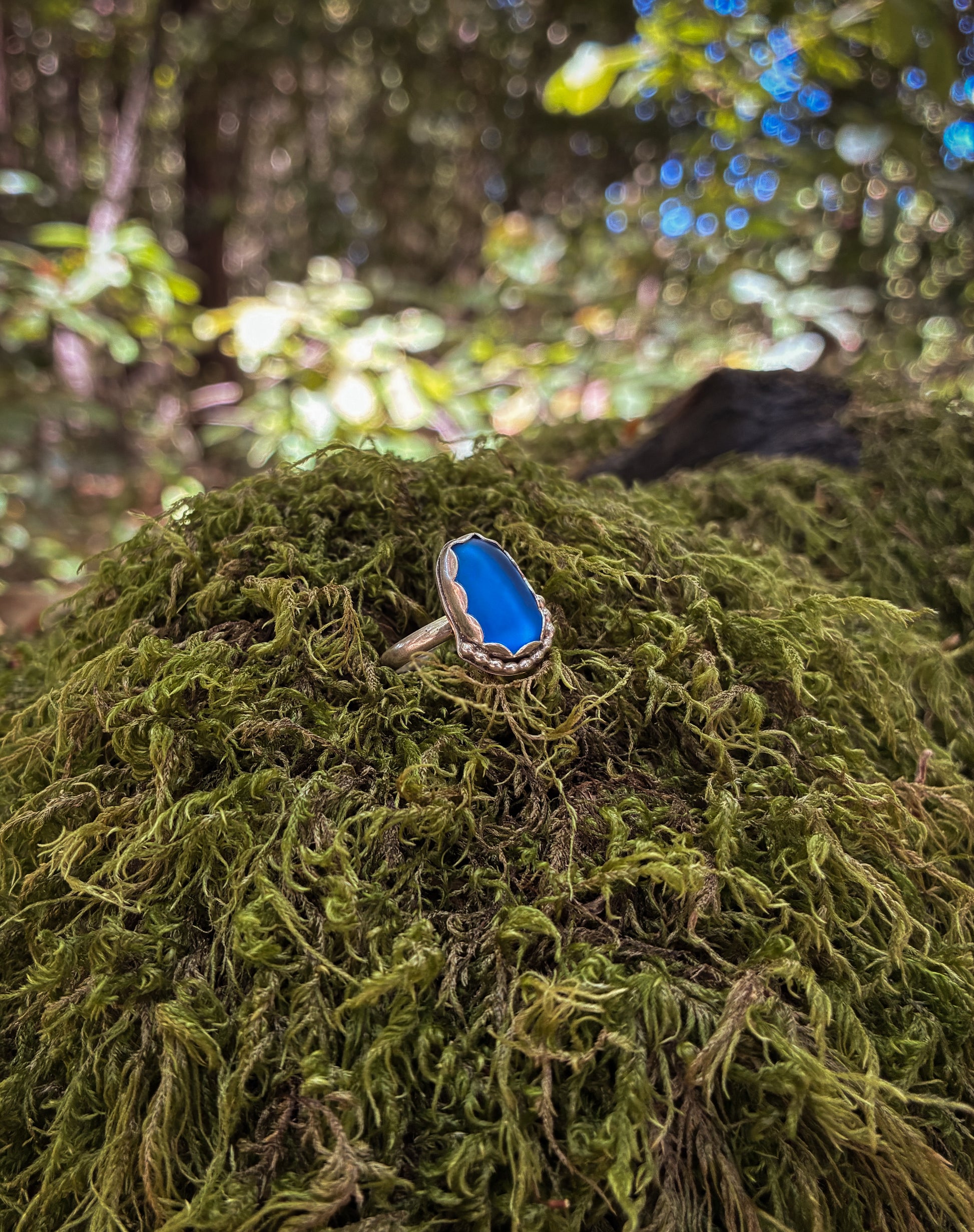 This glowing electric-blue sea glass ring feels like a piece of the sea frozen in time. The vibrant glass, shaped by waves and weathered by years in the ocean, is set in sterling silver with a scalloped bezel and twisted wire detailing.