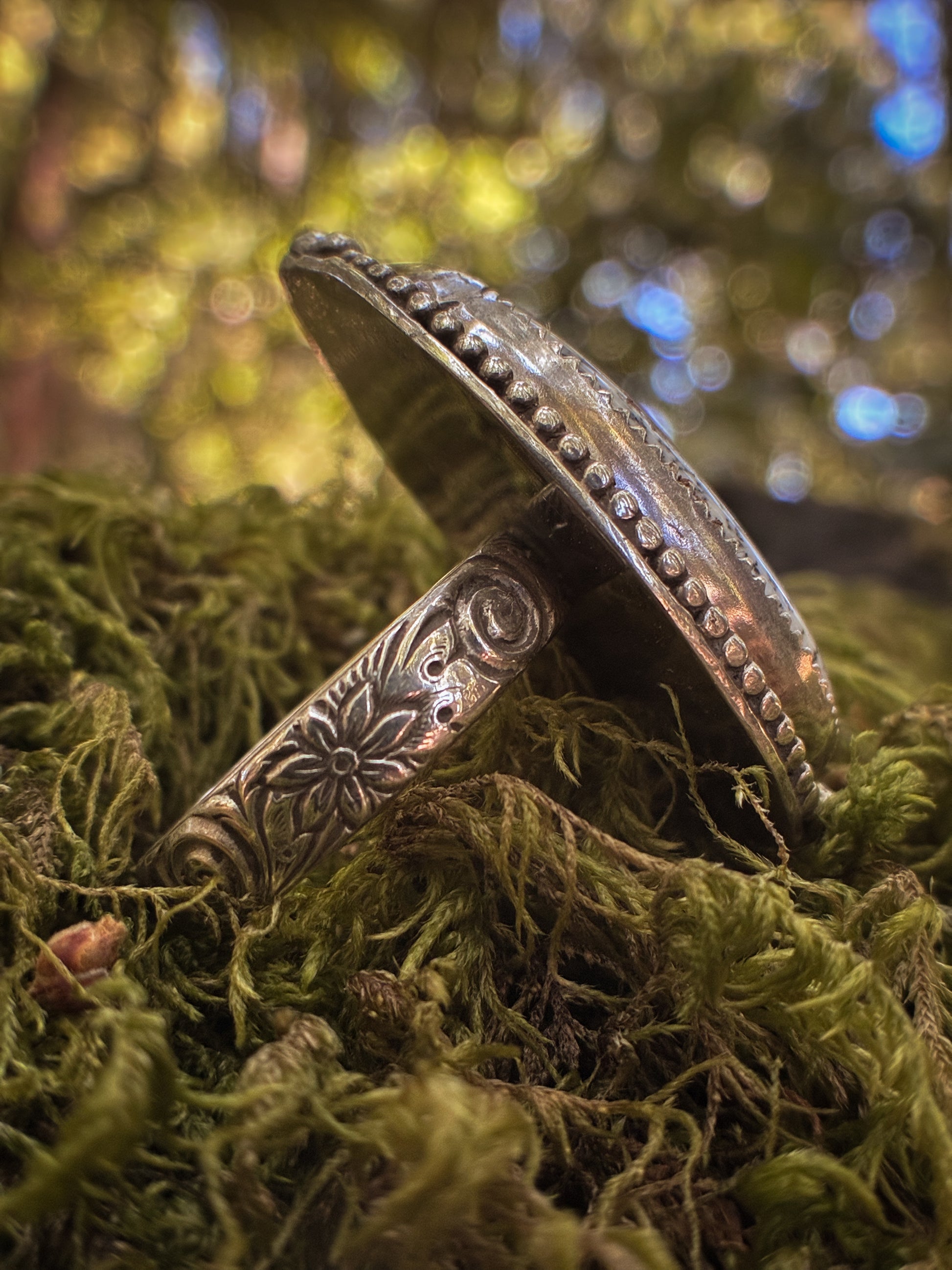 This one-of-a-kind statement ring features a stunning dendritic agate, naturally patterned like tiny branches frozen in time. Set in a bold sterling silver frame with beaded detailing and a floral-engraved band, it carries the stillness and wisdom of the forest in every line.