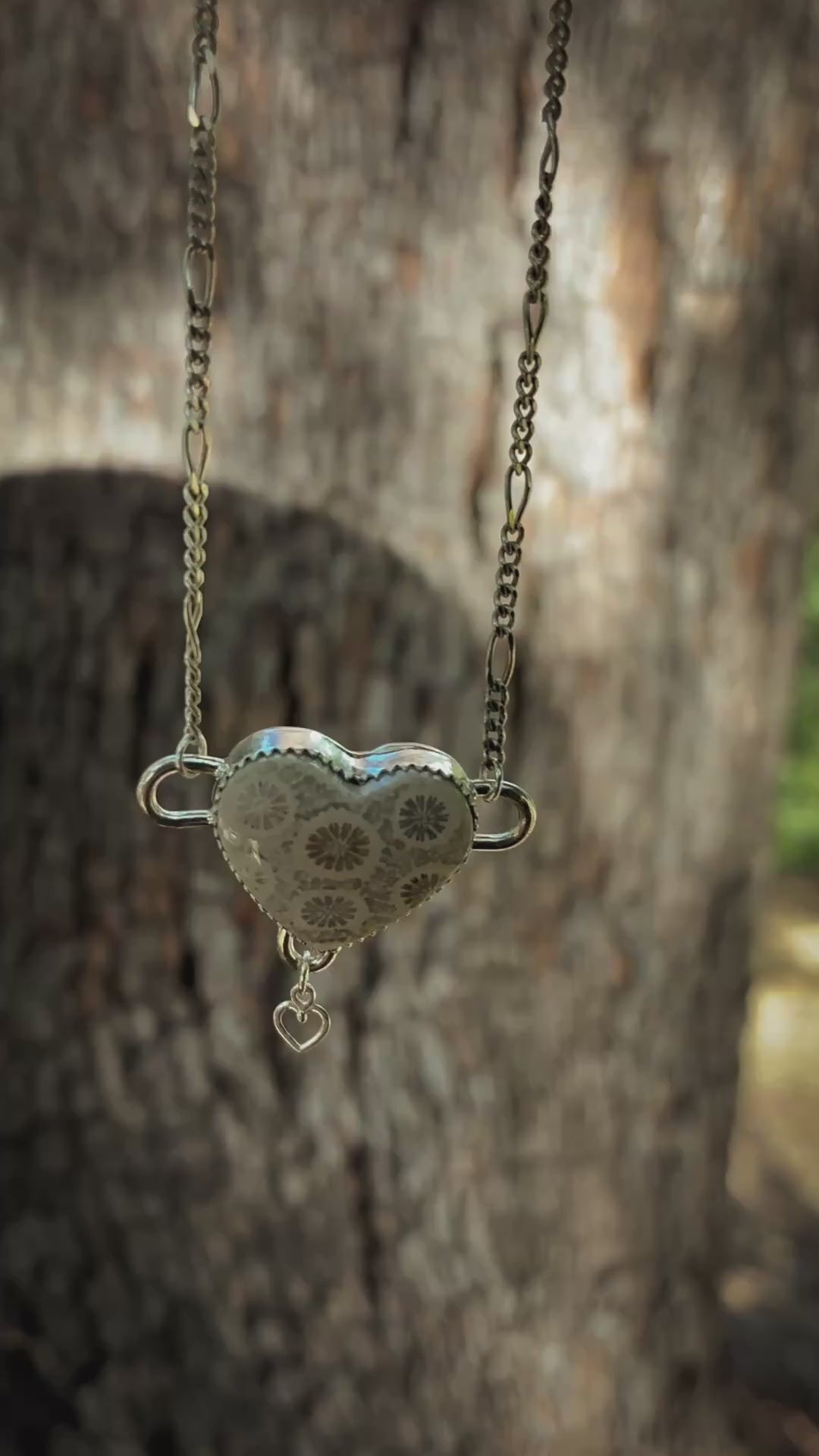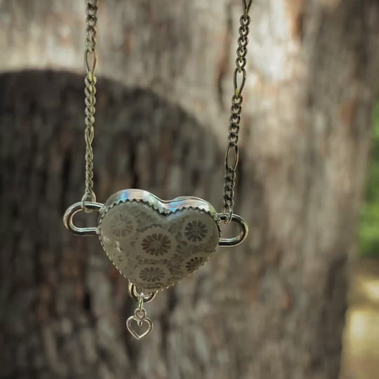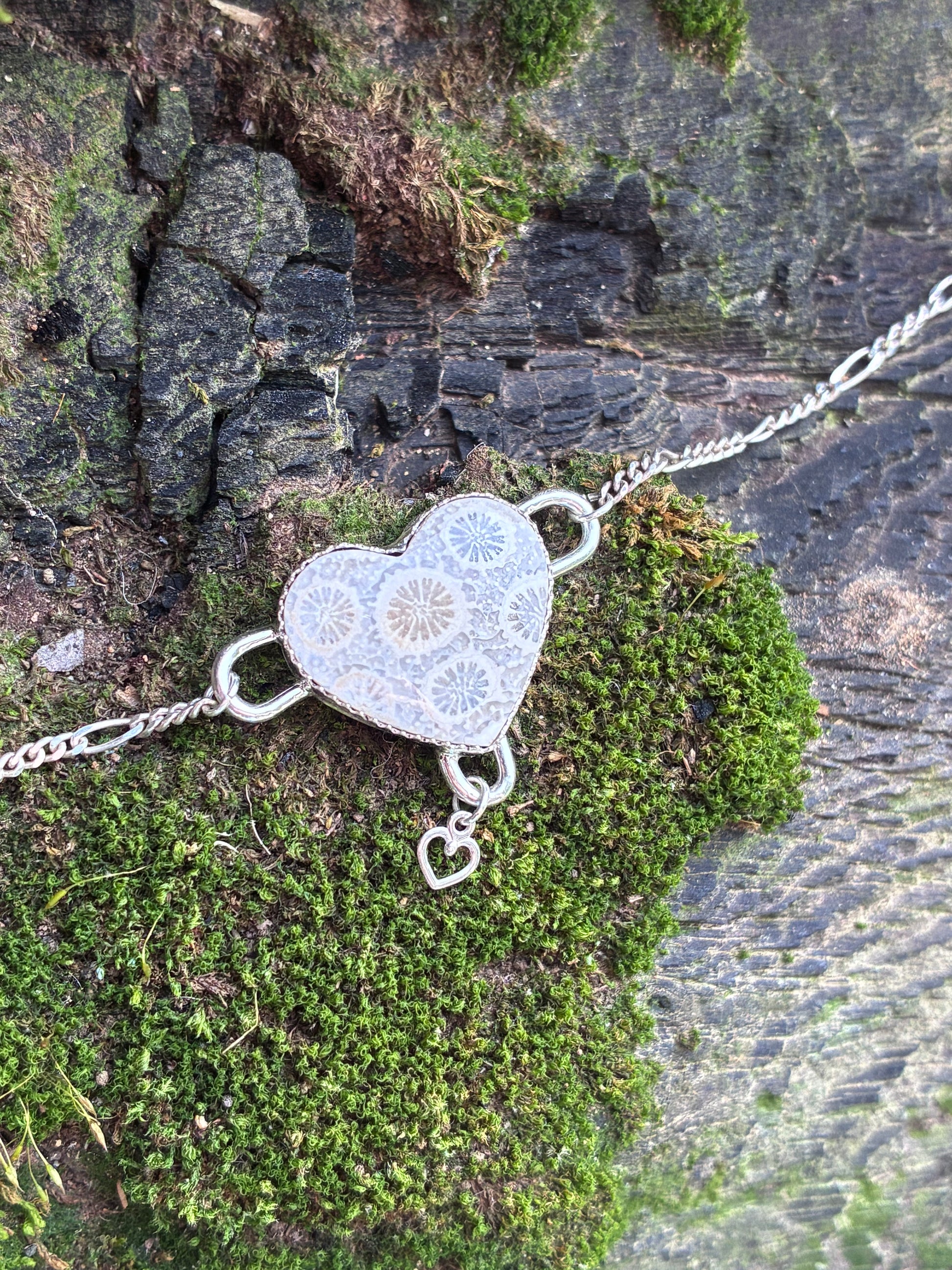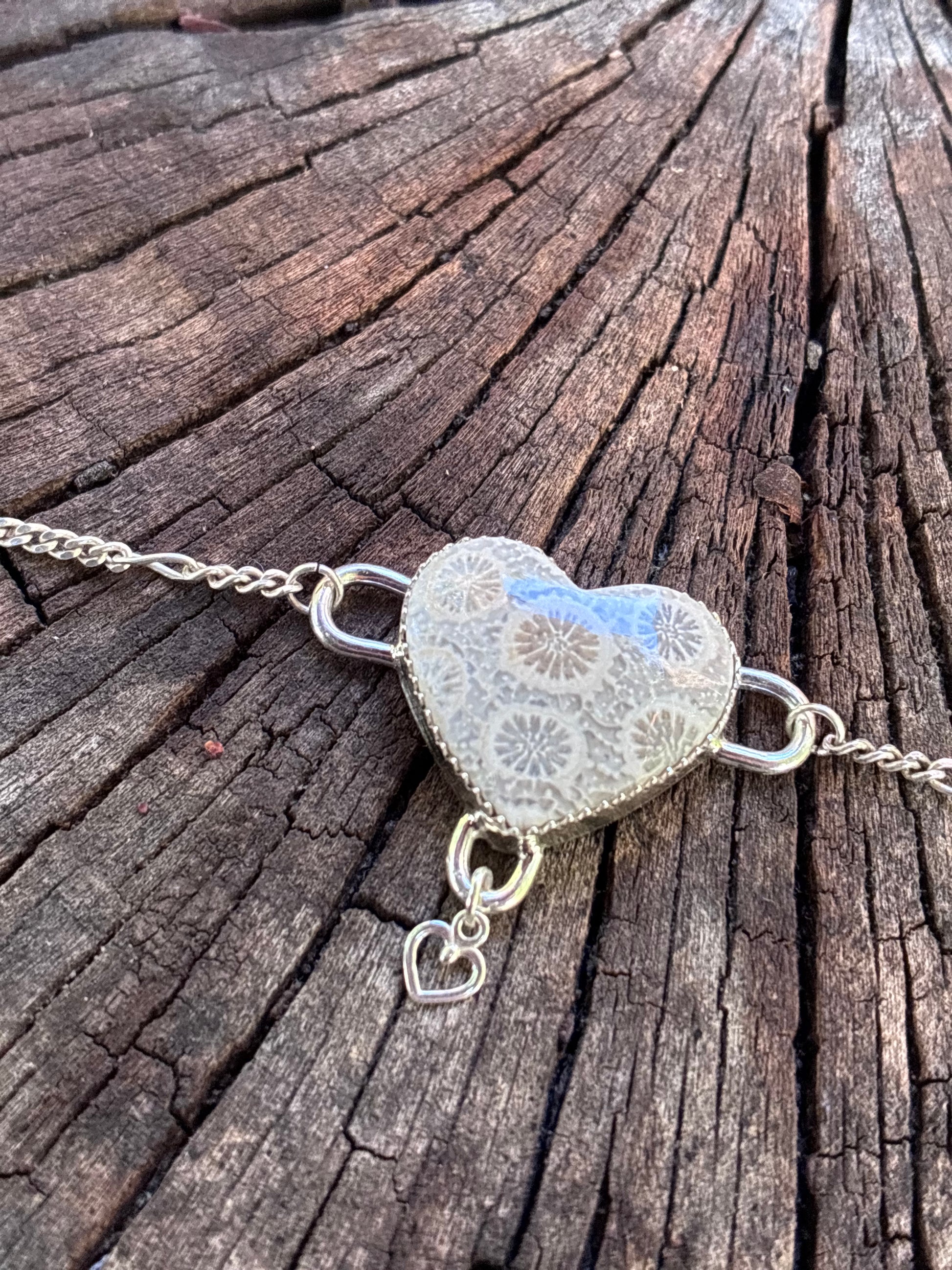 This bracelet features a natural fossil coral heart with beautiful flower-like patterns, set in sterling silver with a sweet heart dangle detail.