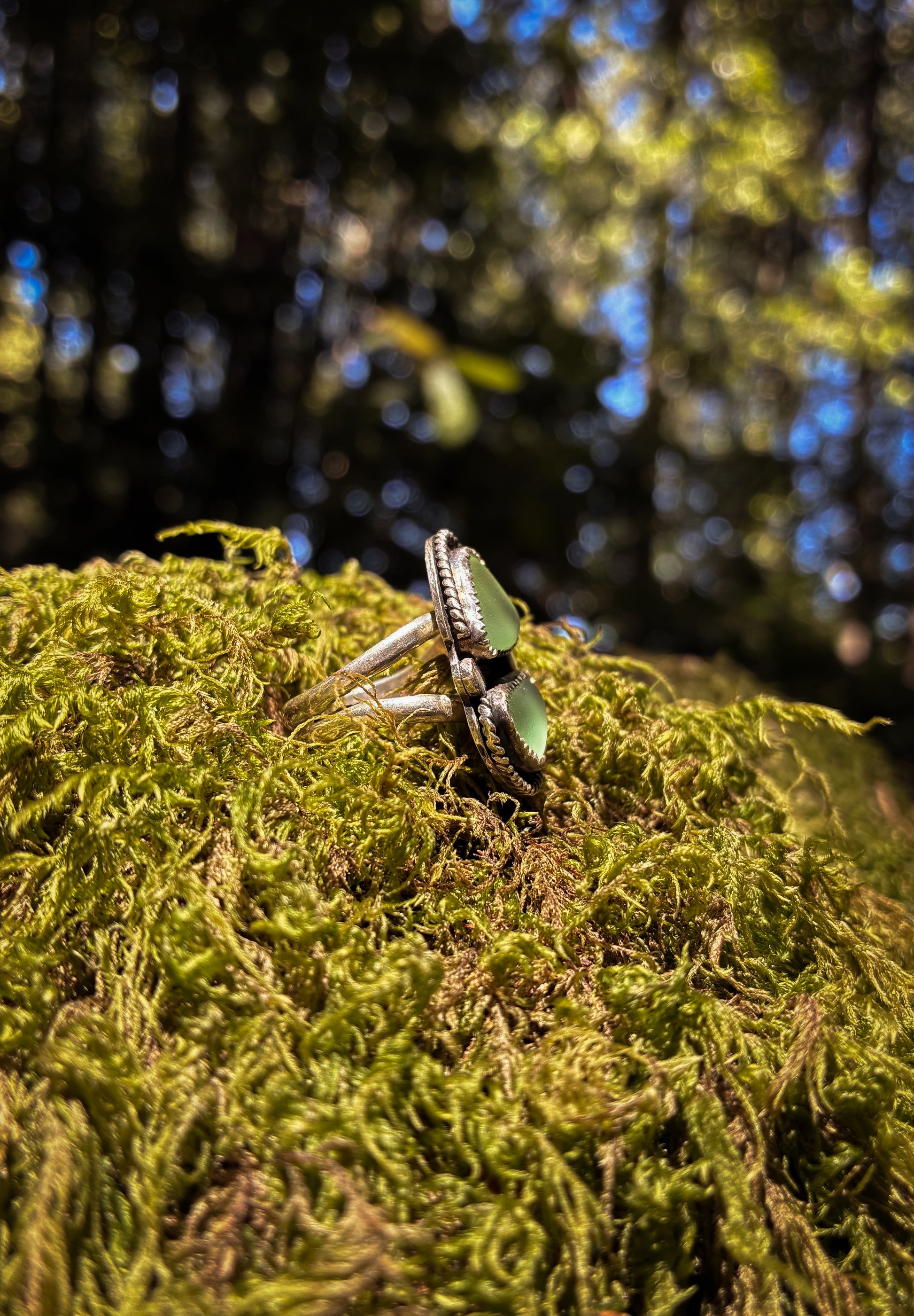 Twin treasures from the sea. This bold double-triangle ring features soft green sea glass, each piece wrapped in a serrated sterling silver bezel and framed with twisted rope detailing. Earthy, striking, and full of soul, it evokes mossy forest paths, sea mist, and windswept coastal cliffs.