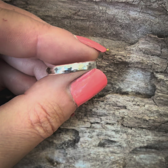 Bold yet refined, this handcrafted sterling silver ring features a hammered texture that reflects light with every movement. The organic pattern adds depth and character, making it perfect for stacking or wearing solo as a statement of understated elegance.