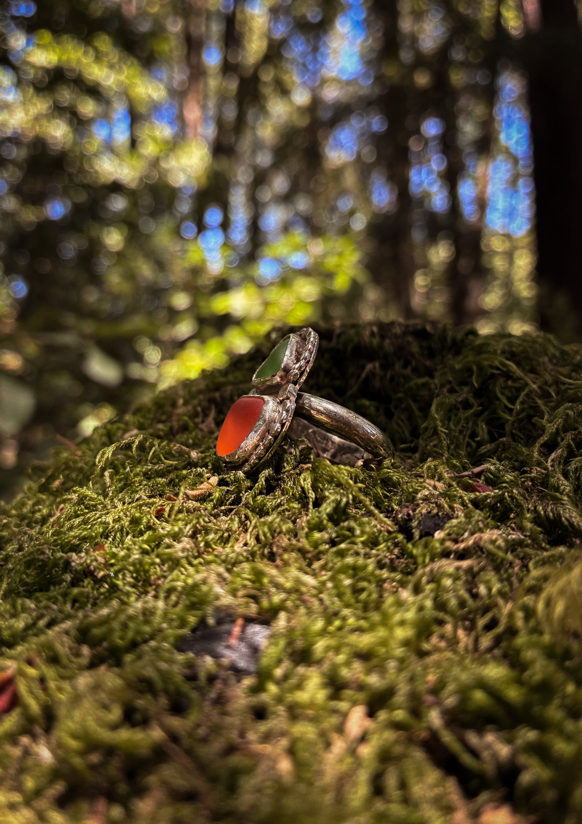 Handcrafted in sterling silver and set with glowing pieces of genuine sea glass β vibrant orange and earthy green β this ring captures the playful spirit of a pumpkin patch in jewelry form.