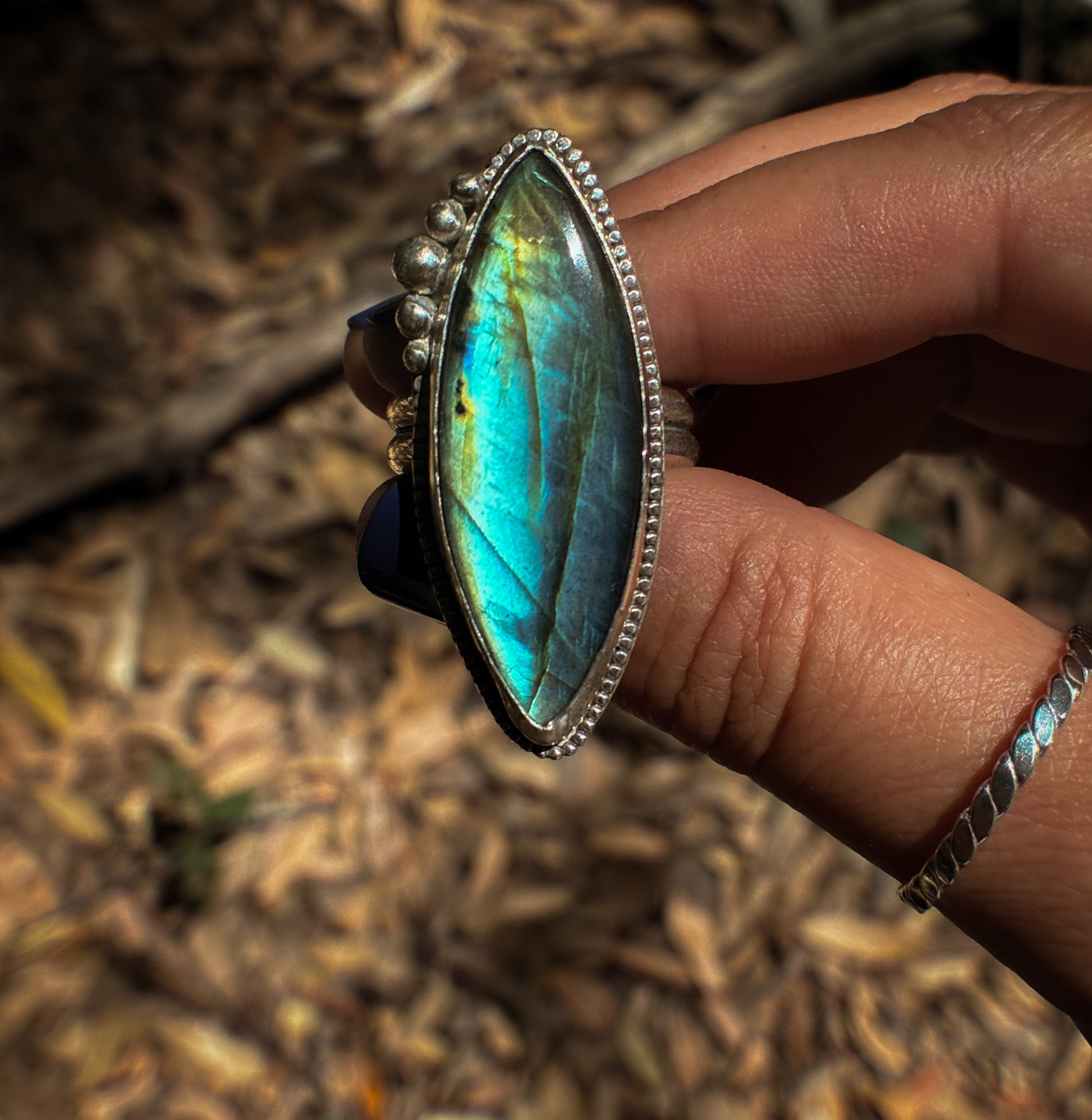 A flash of forest magic. This marquise-cut labradorite shimmers with ethereal blue light, set in sterling silver with beaded wire detailing and a sturdy double band. Bold, simple, and made entirely by hand, it’s a piece that balances strength and elegance.
