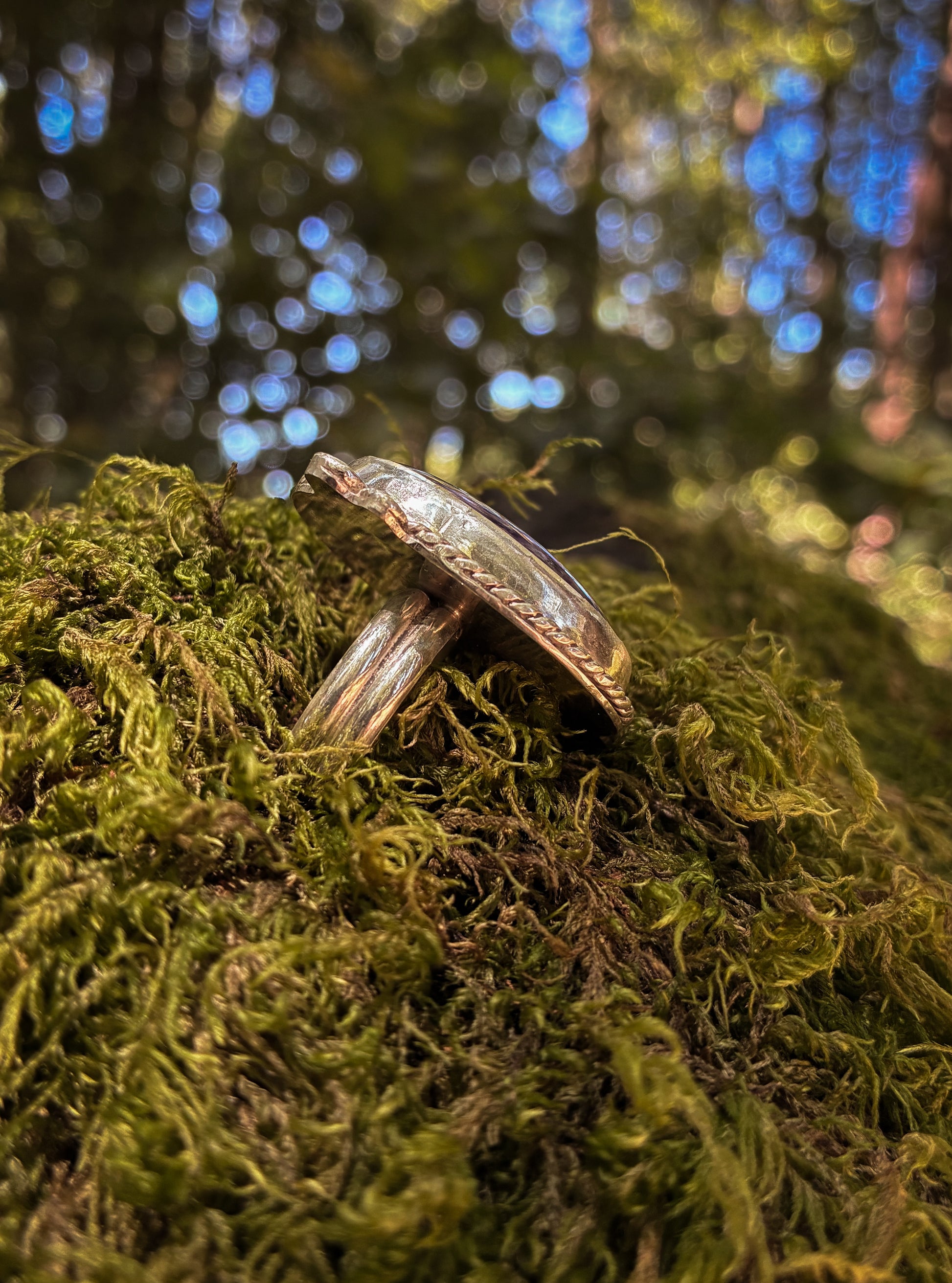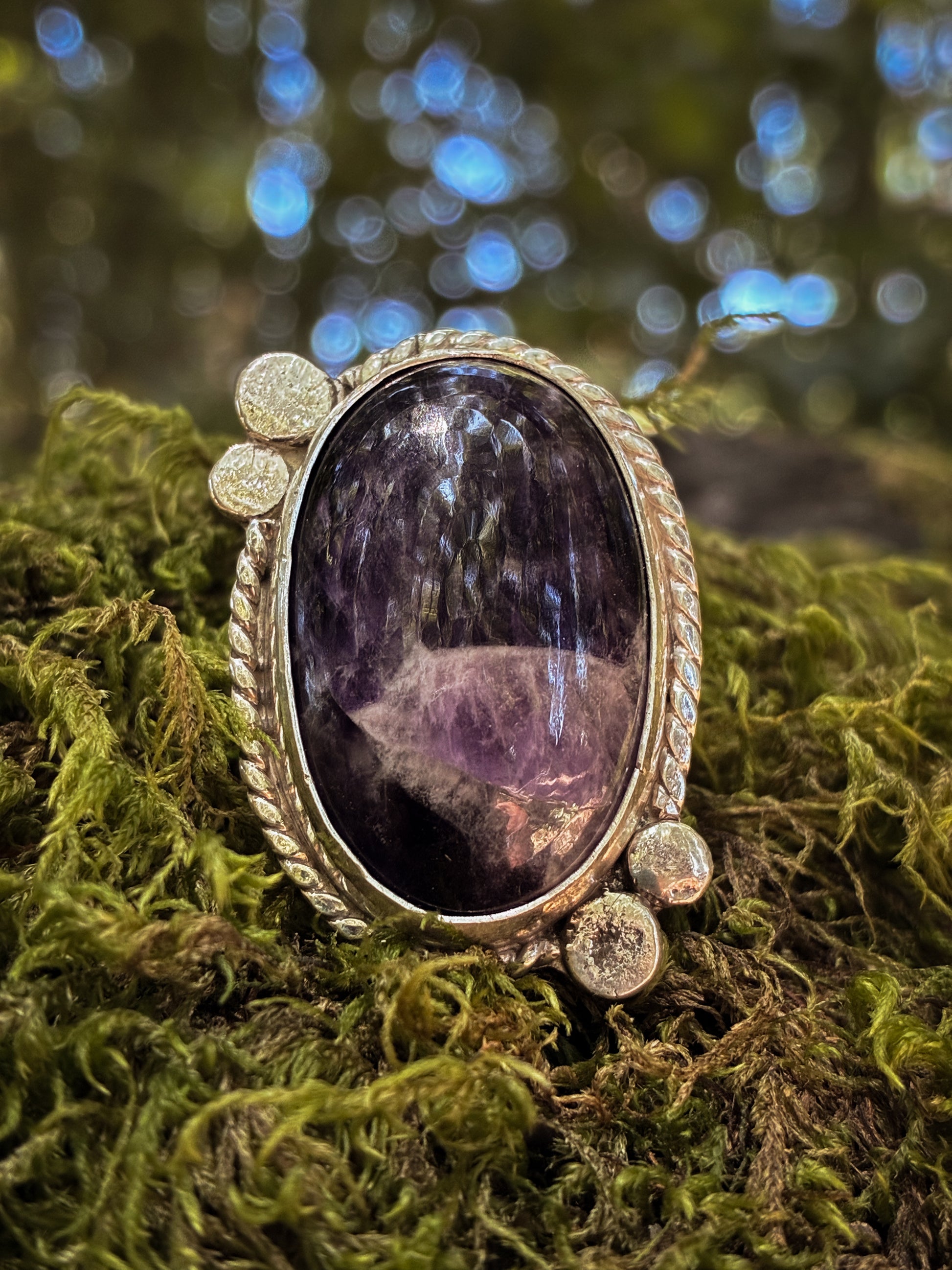 A dreamy storm of purple and silver, this Lepidolite ring holds calming energy and natural beauty in every swirl. The deep lavender stone is wrapped in sterling silver with textured details and a twisted wire border—evoking the glow of full moonlight filtering through enchanted clouds.