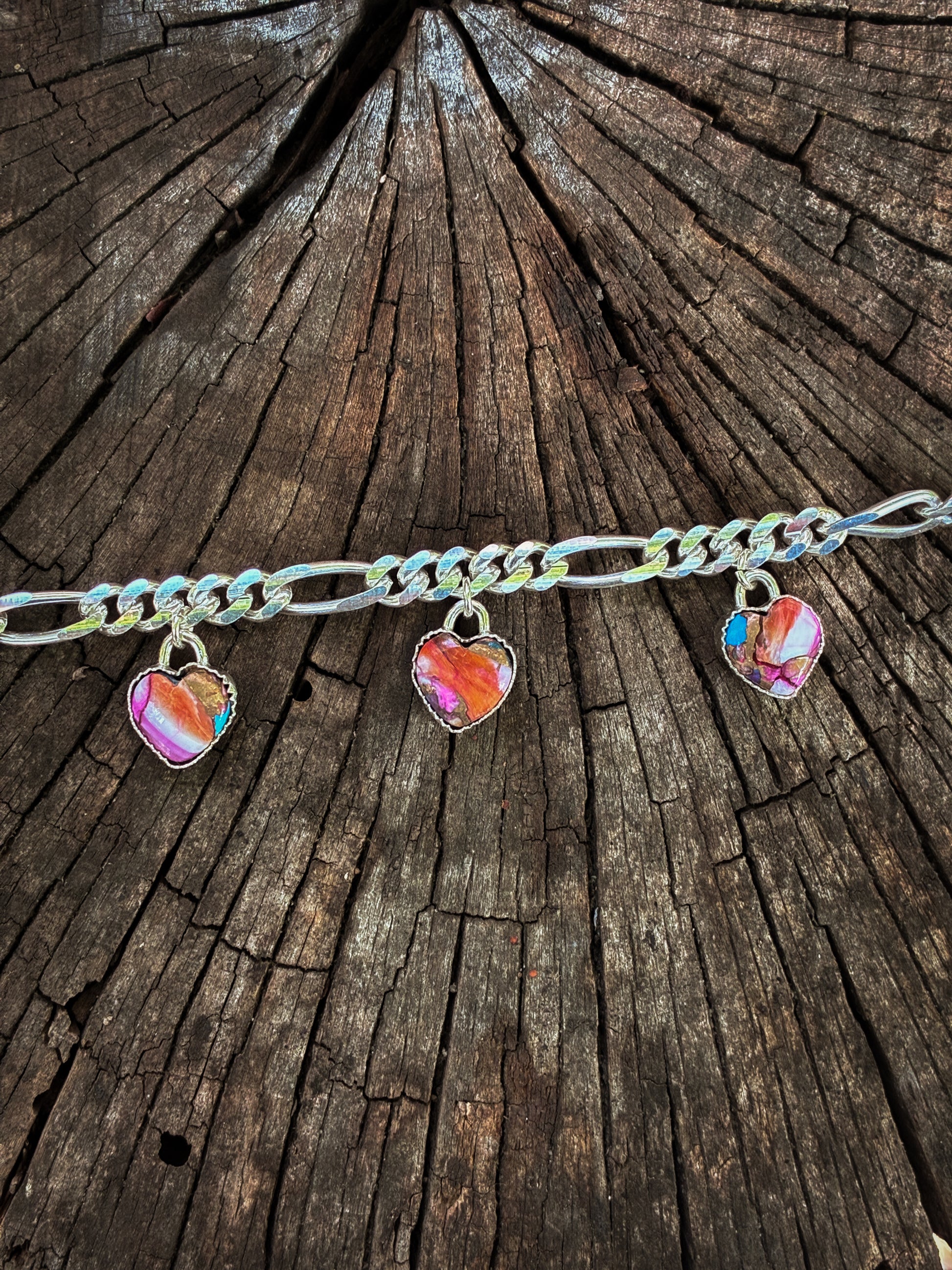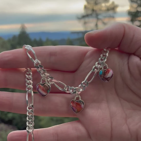 This statement necklace features three heart charms made with vibrant pink oyster shell, creating the perfect Valentine vibe while still feeling earthy, bold, and wearable.