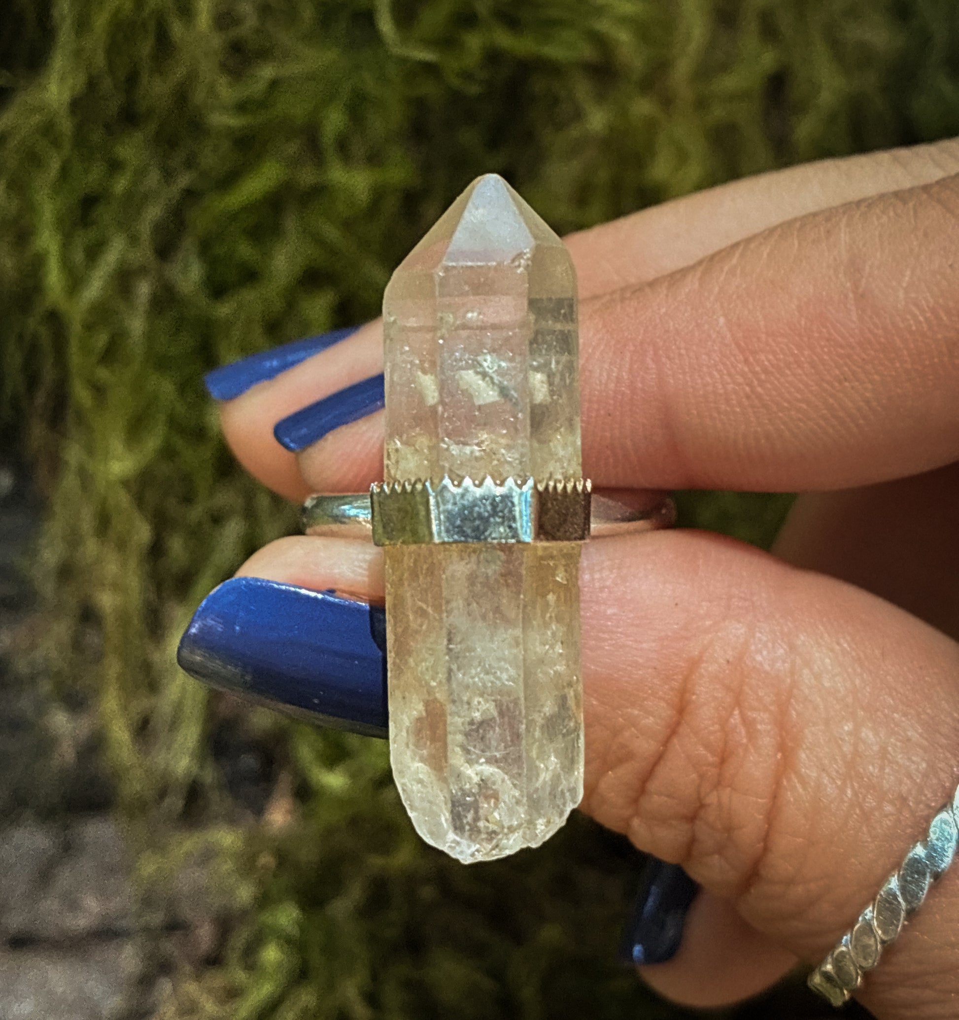 A statement piece rooted in the wild—Witchwood is a raw double-terminated quartz crystal set in sterling silver with a serrated bezel, radiating elemental power. This ring was crafted for forest witches, crystal healers, and lunar dreamers alike.