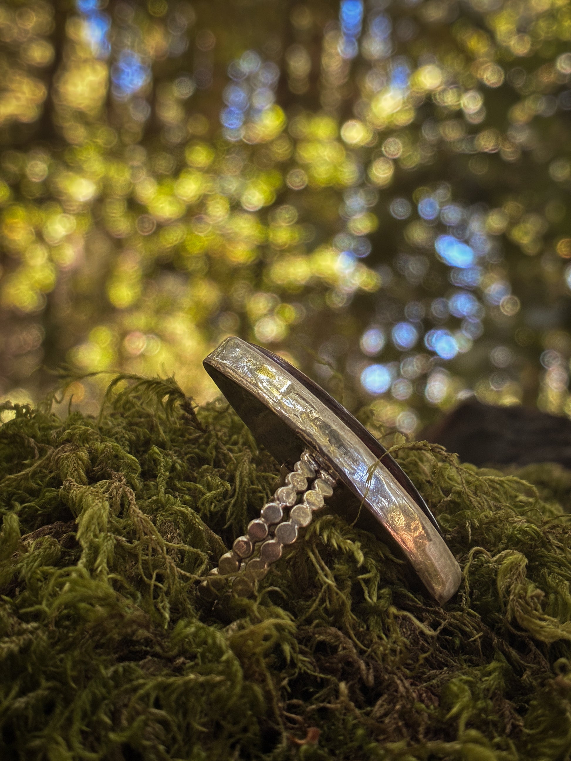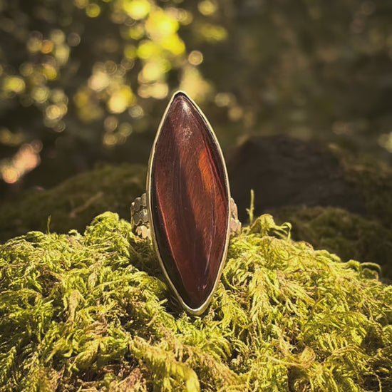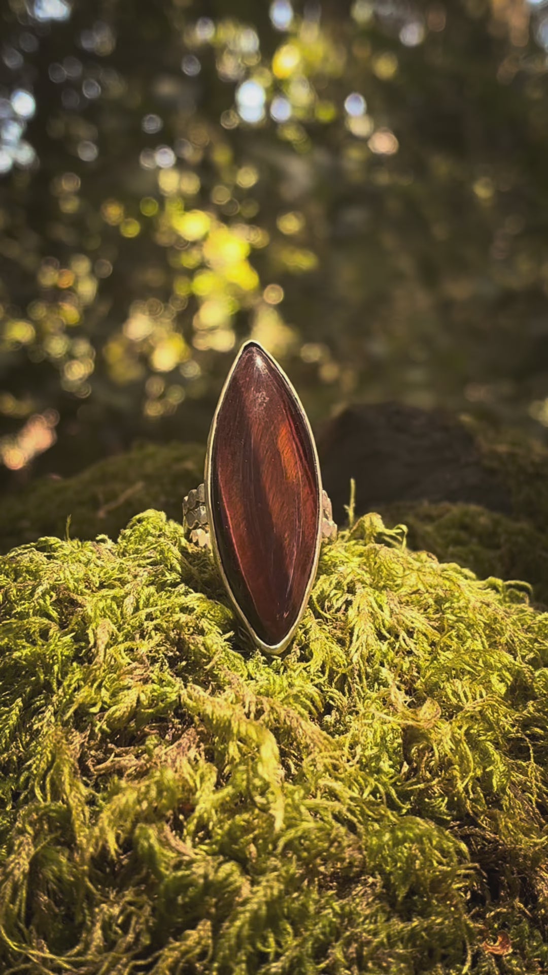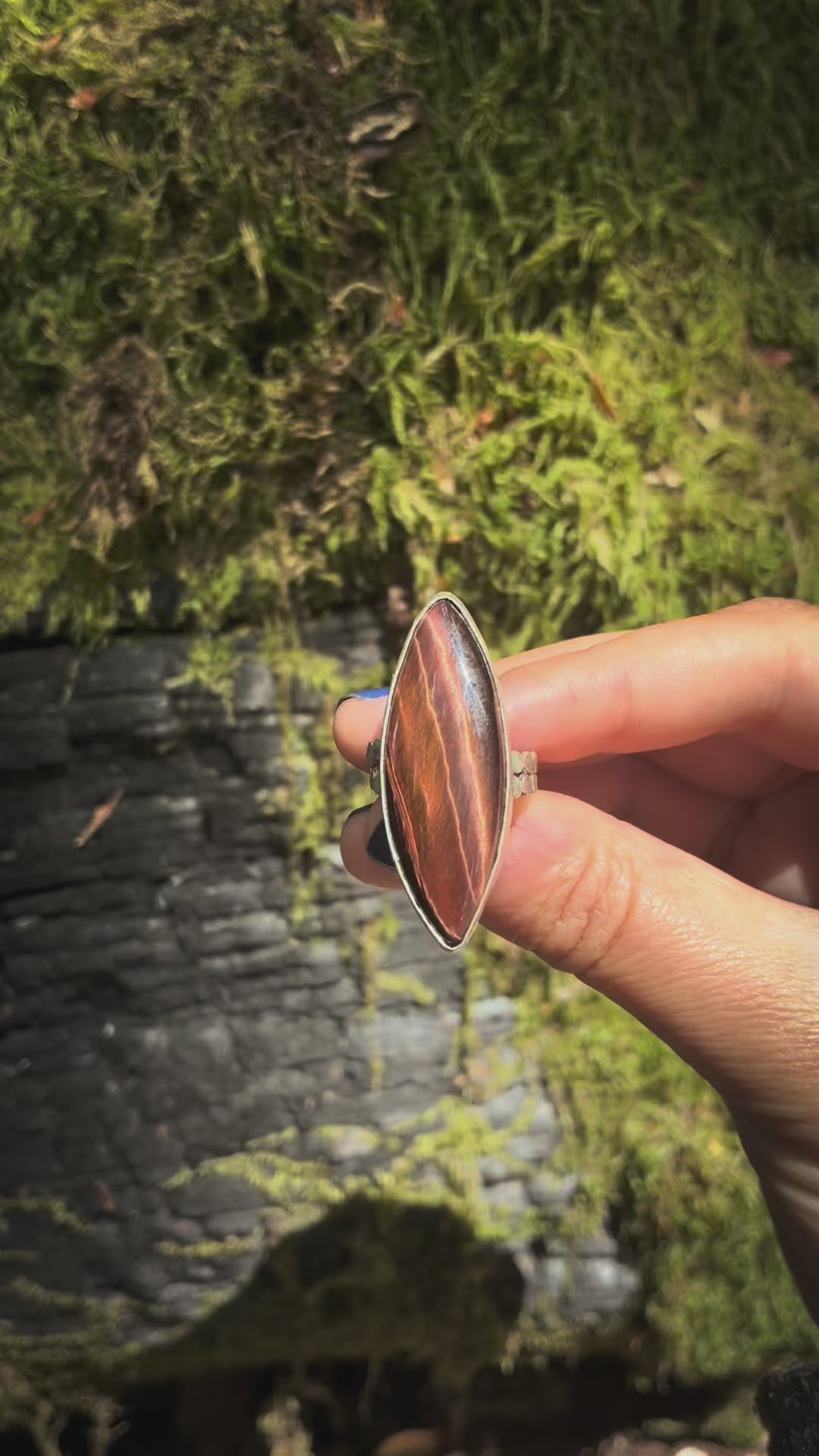 A deep brown Tiger’s Eye shimmers with silky bands of copper, mahogany, and burnished gold—like fire beneath the surface. Set in sterling silver with a unique bead-hammered band, this ring blends texture and tone in a bold, grounding design.