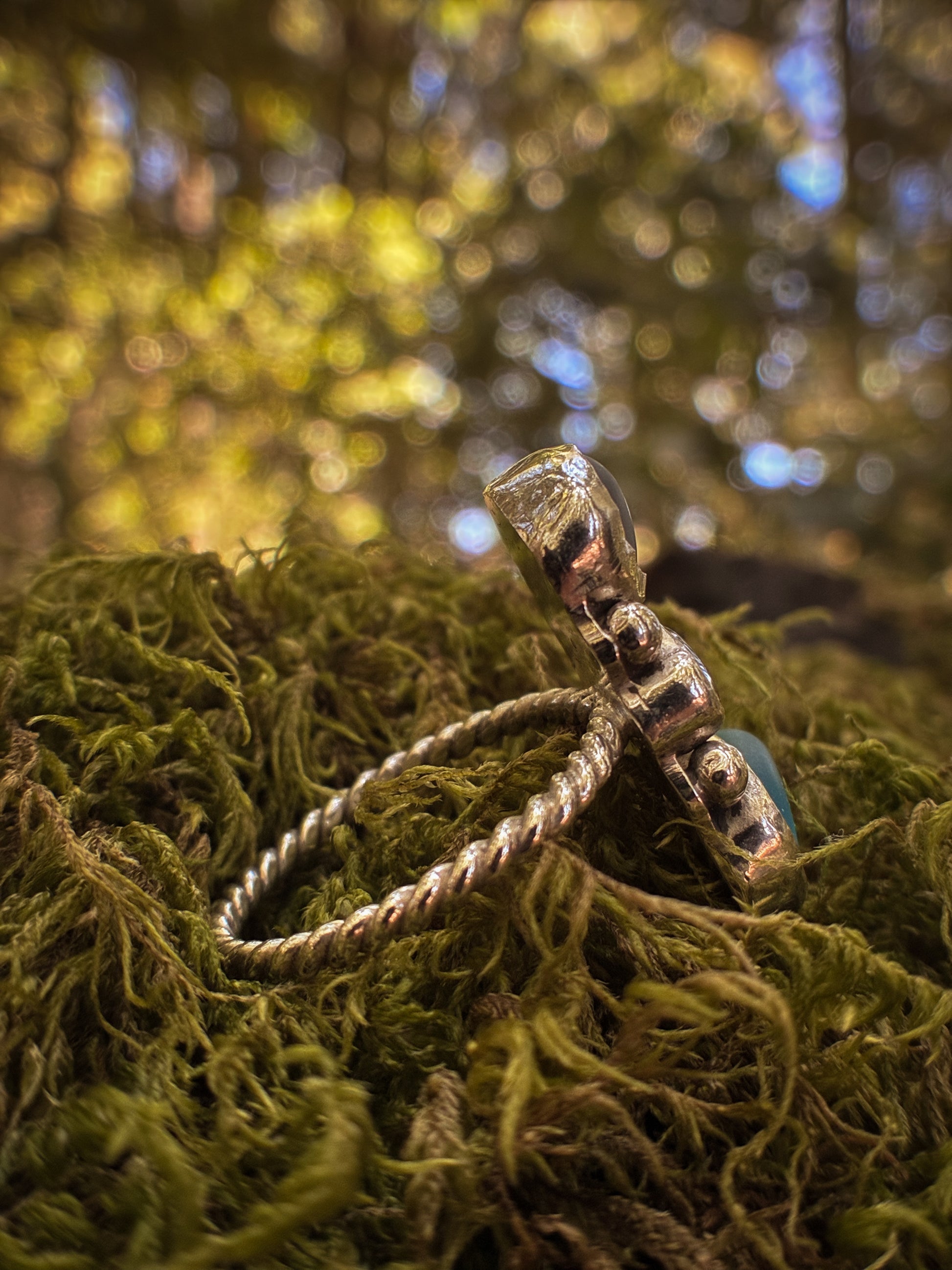 Like sunlight dancing through waves, this coastal-inspired ring captures the calming rhythm of the sea. A trio of ocean-hued stones — frosted sea glass, deep blue kyanite, and smooth aqua glass — are hand-set in custom sterling silver bezels with delicate silver bead accents. The twisted sterling band adds subtle movement and tide-like flow.