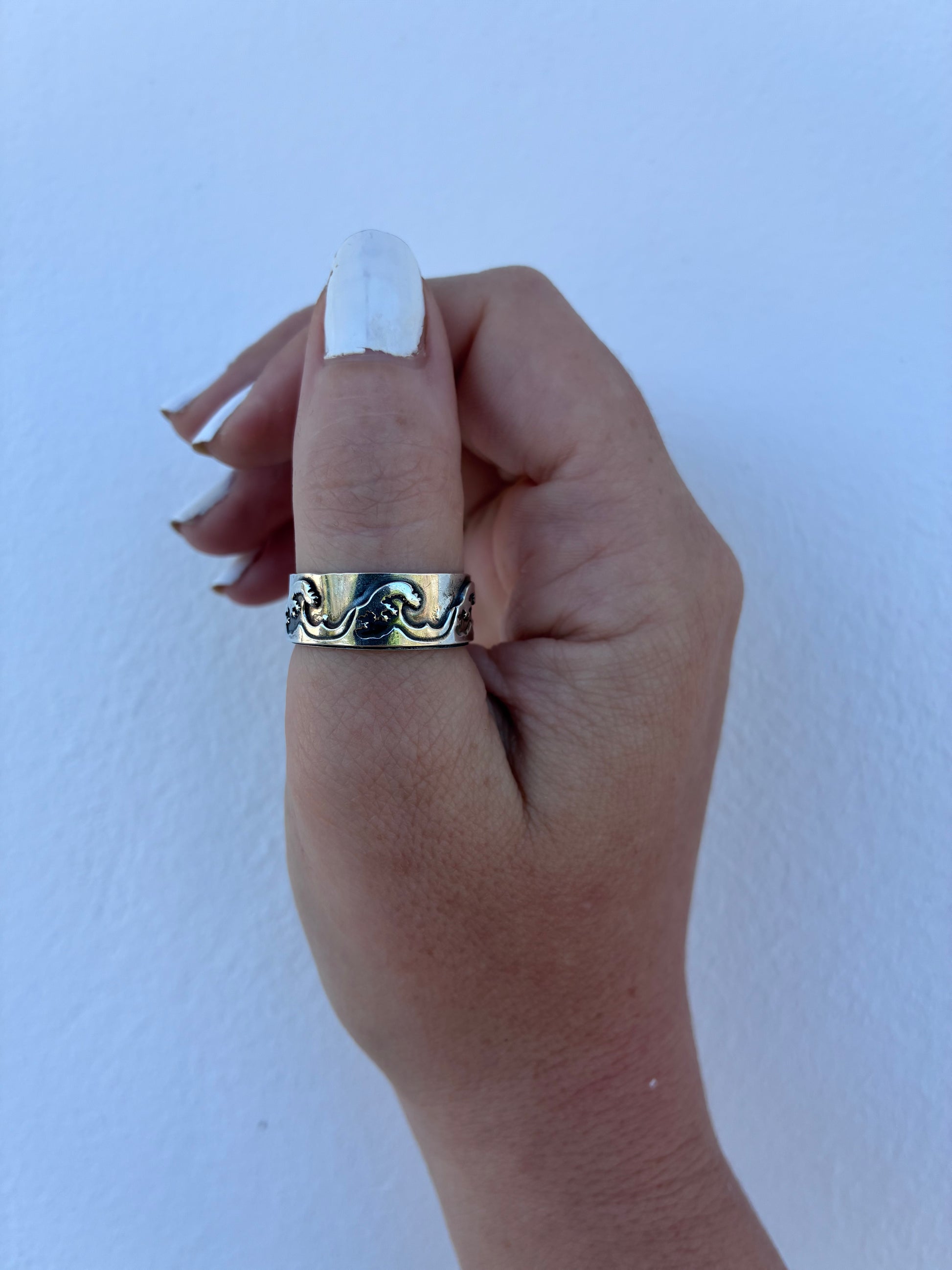 Rolling ocean waves captured in solid sterling silver.