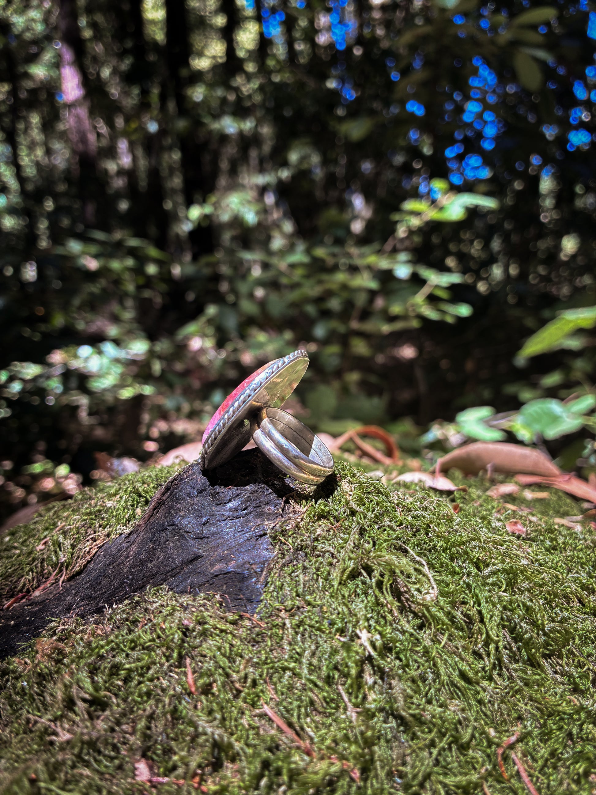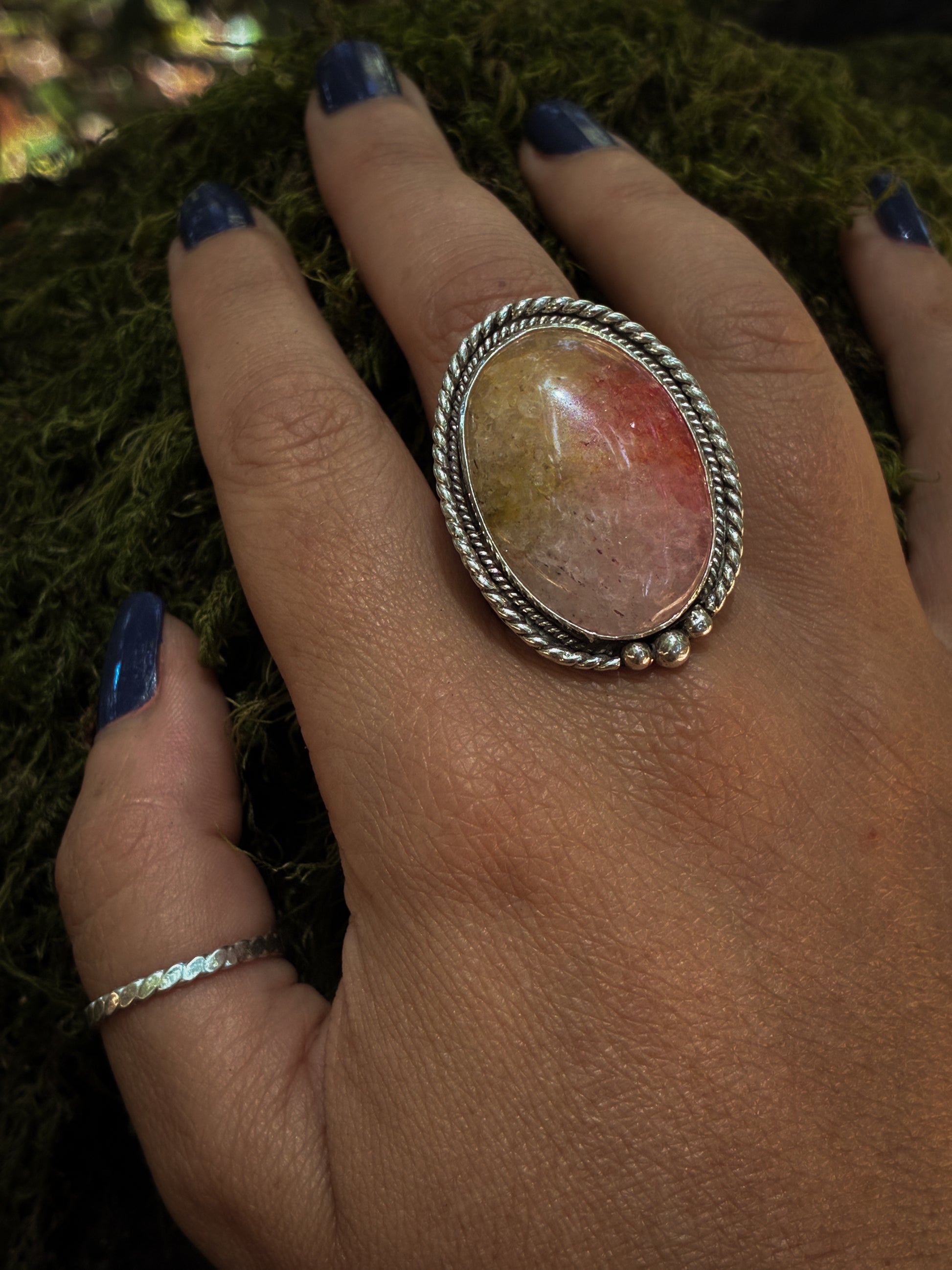 Bursting with summer joy, Sunset Sorbet is a vibrant statement ring handcrafted with love and intention. The center stone—a dyed quartz cabochon—radiates soft pinks, peaches, and golden tones, like the last light of day melting into your fingertips.