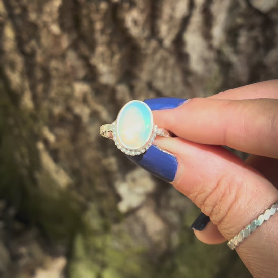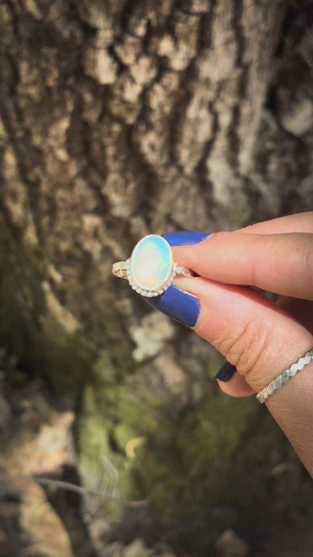 Like a glimpse into another world, Moonveil features a captivating oval Ethiopian opal bursting with cosmic color—fiery orange and gold embers wrapped in glacial blues and flashes of neon green. Set in a sterling silver bezel with a beaded halo and twisted band, this ring blends wild magic with elegant structure.