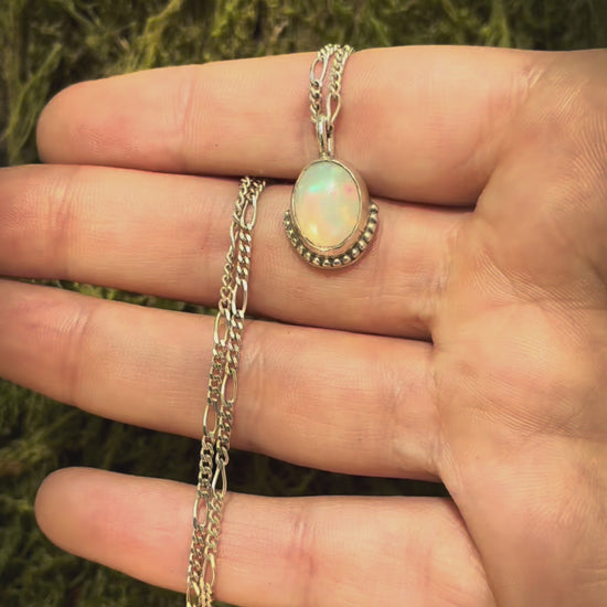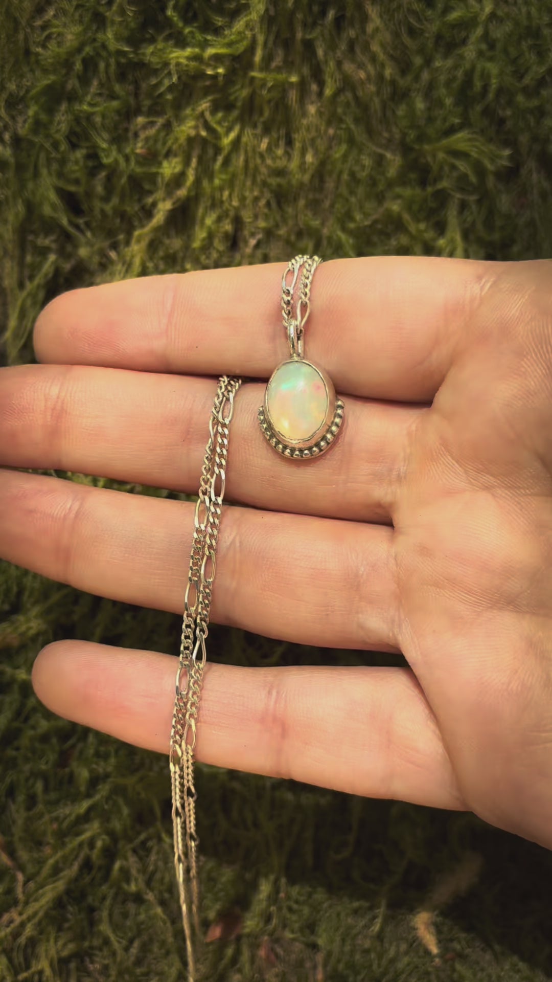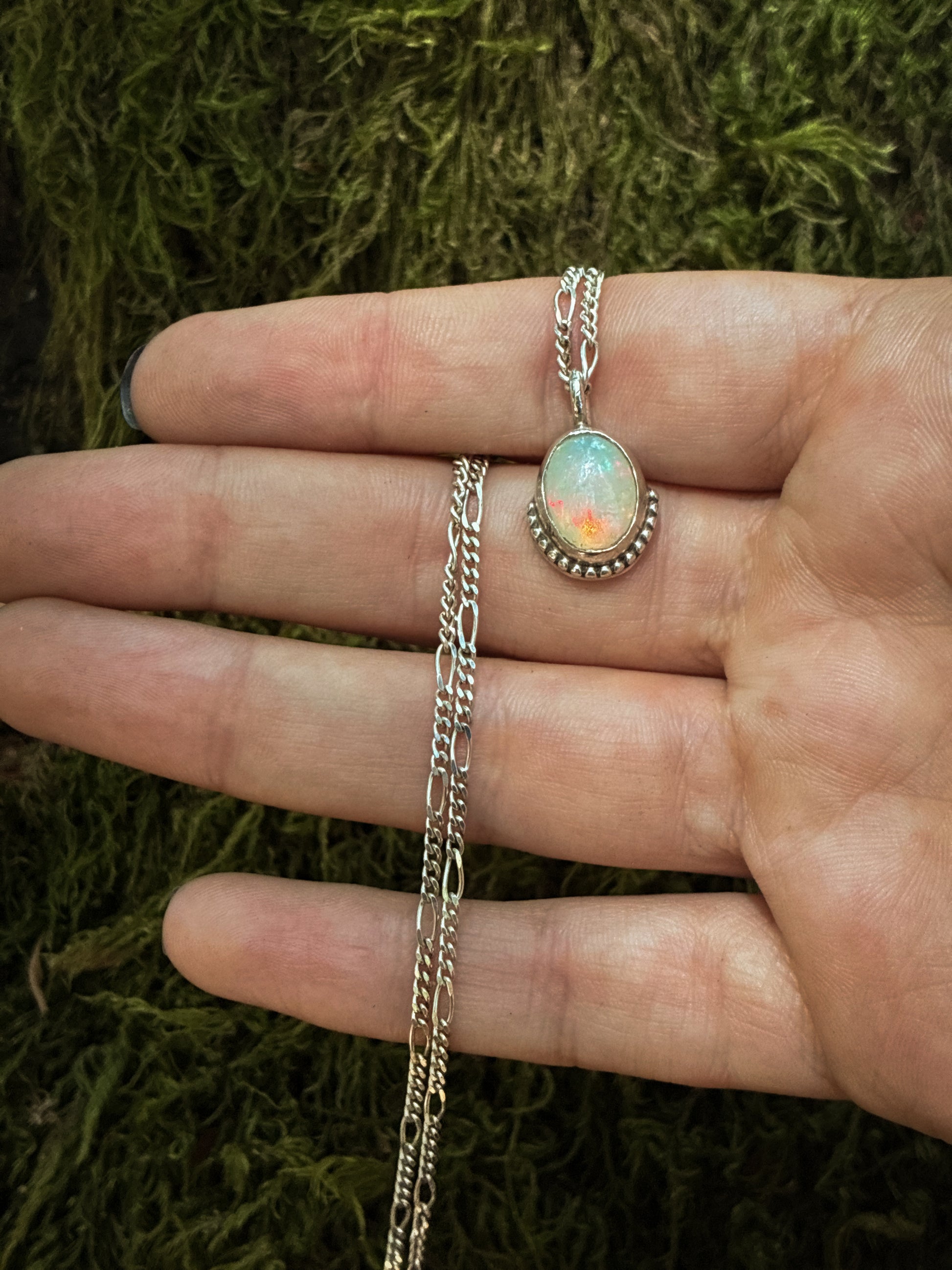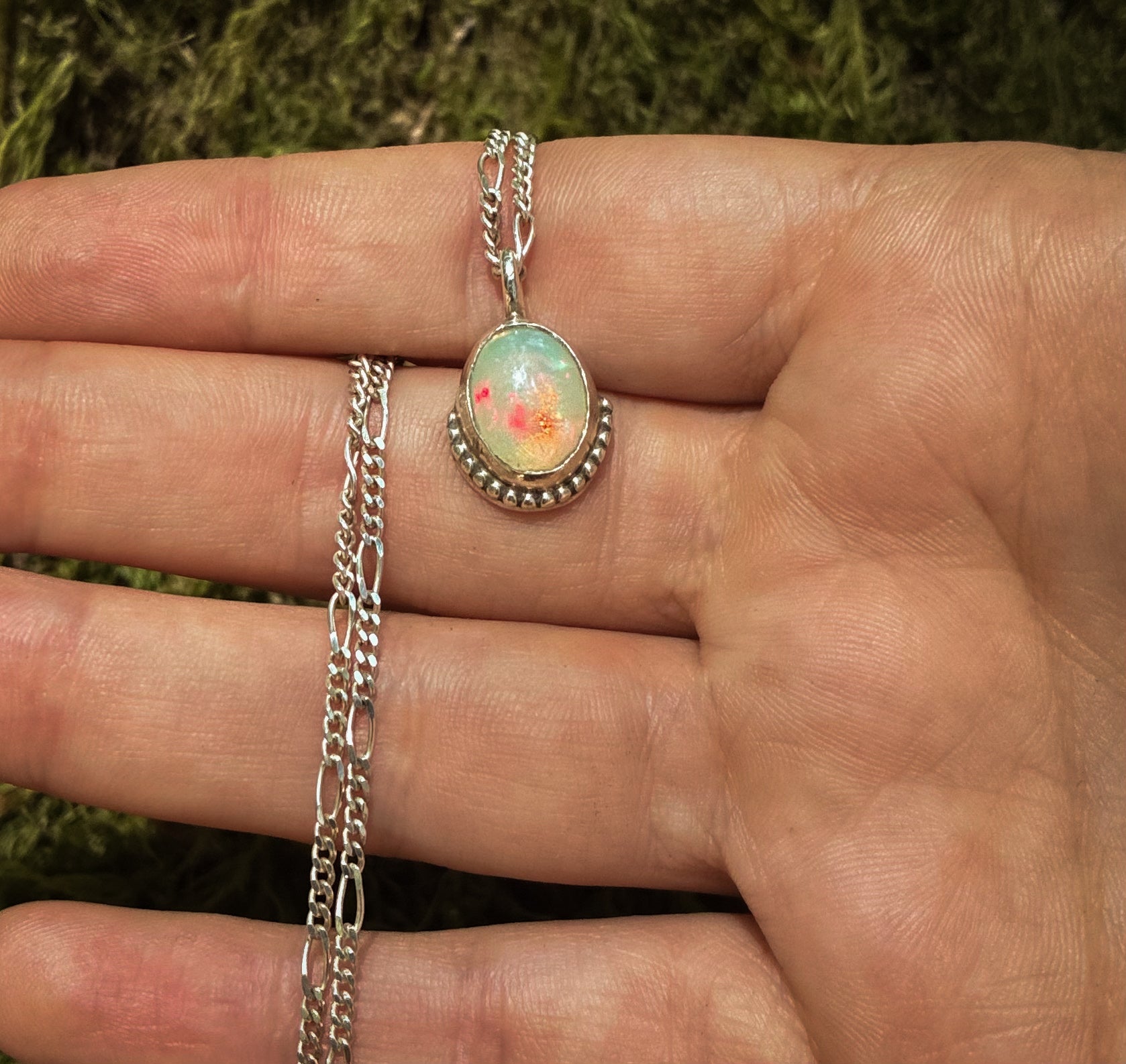 This enchanting sterling silver pendant features a fiery Ethiopian opal glowing with sunrise tones—blushing pinks, sun-drenched oranges, and ethereal blues. Nestled in a simple bezel with a beaded crescent halo, Sunrise Spirit captures the warmth and mystery of early morning light in the forest.