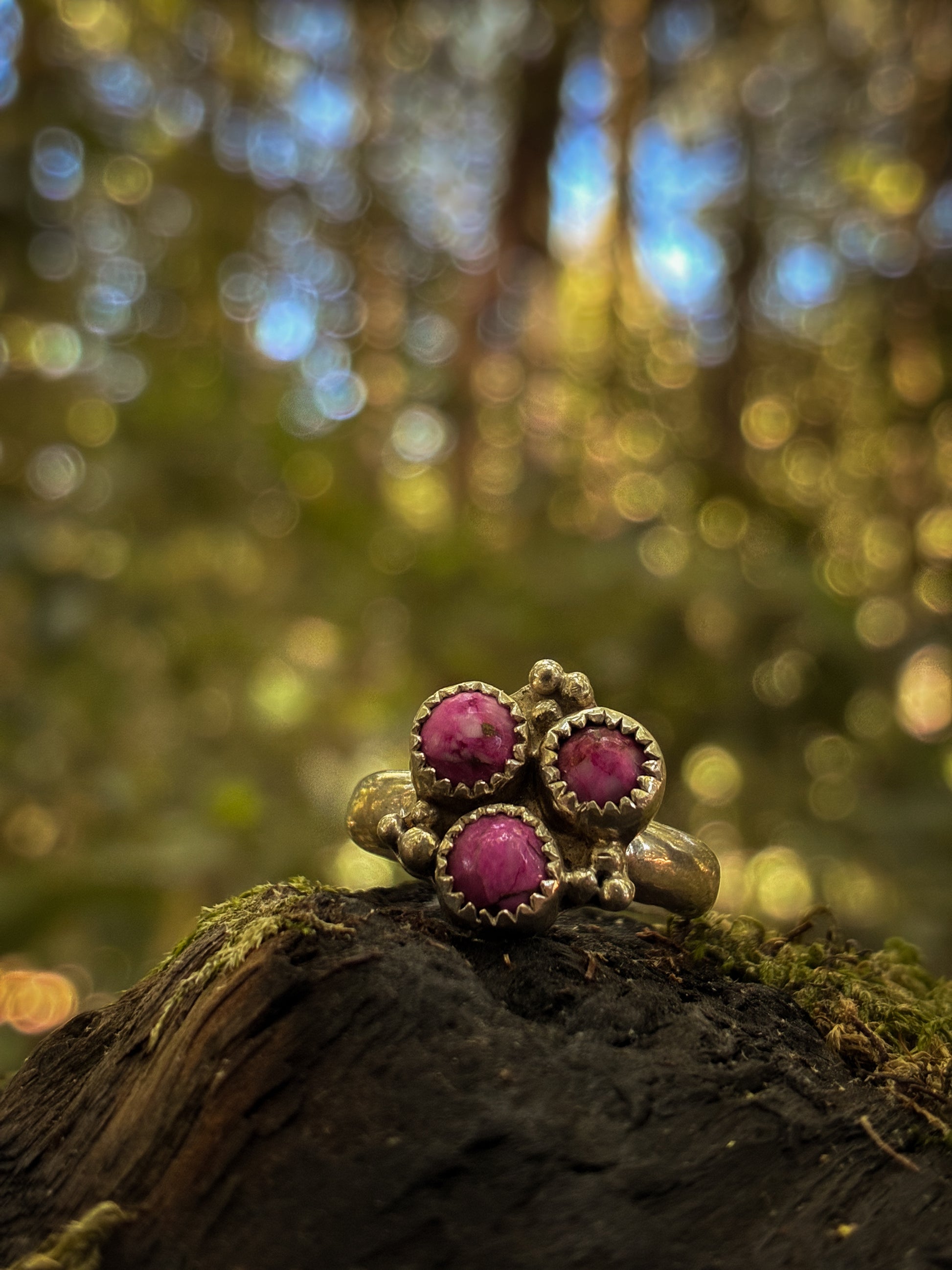 Three vibrant pink turquoise stones sit in serrated sterling silver bezels on a hand-textured band, accented with silver granules that add a vintage, romantic touch. The bold color and ornate details give this piece personality and charm, making it a true standout.